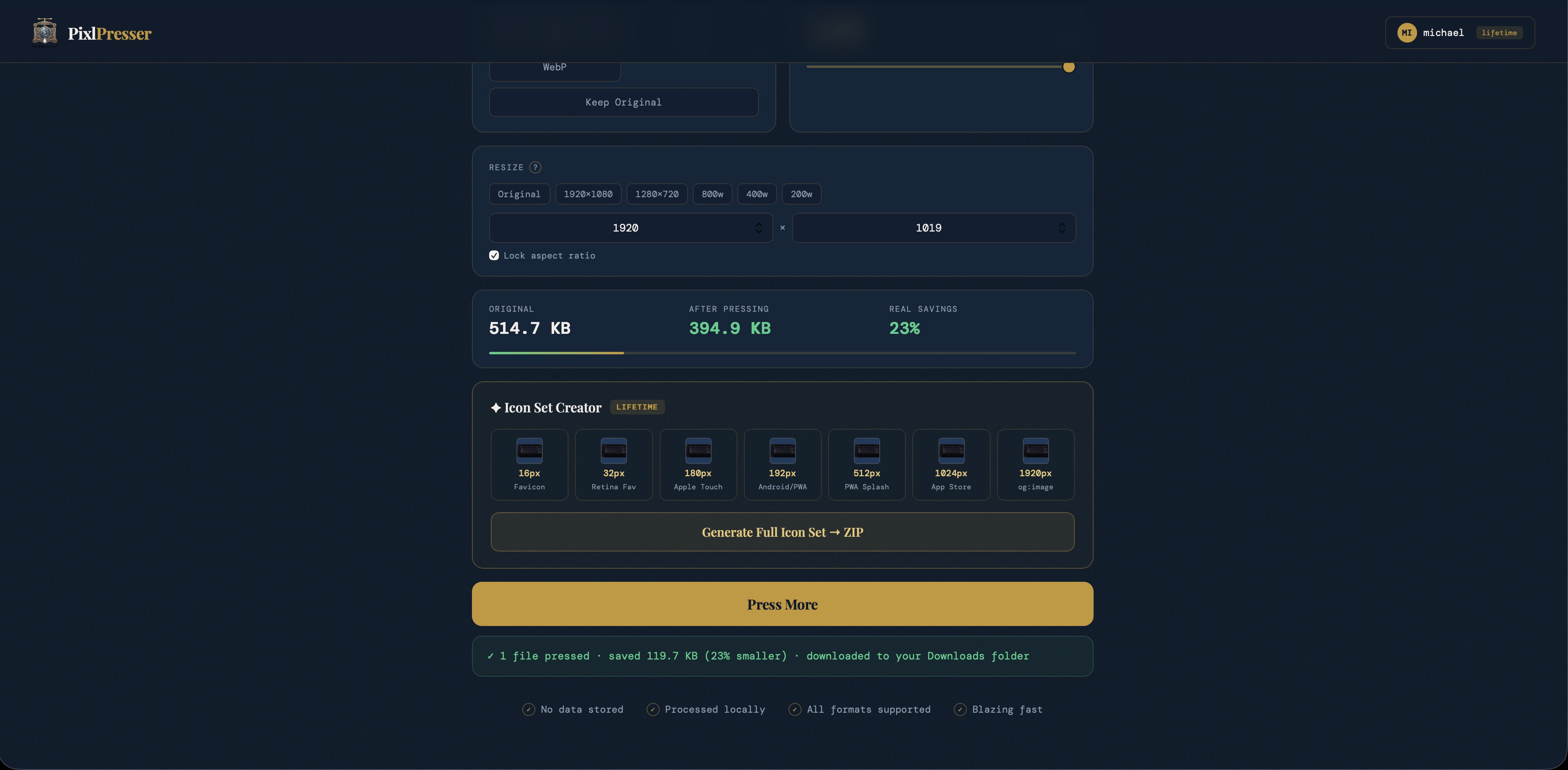 Compress images without losing quality. Free tier, $1/mo, or $10 lifetime. Ships with Stripe, Supabase auth, navy/gold UI.